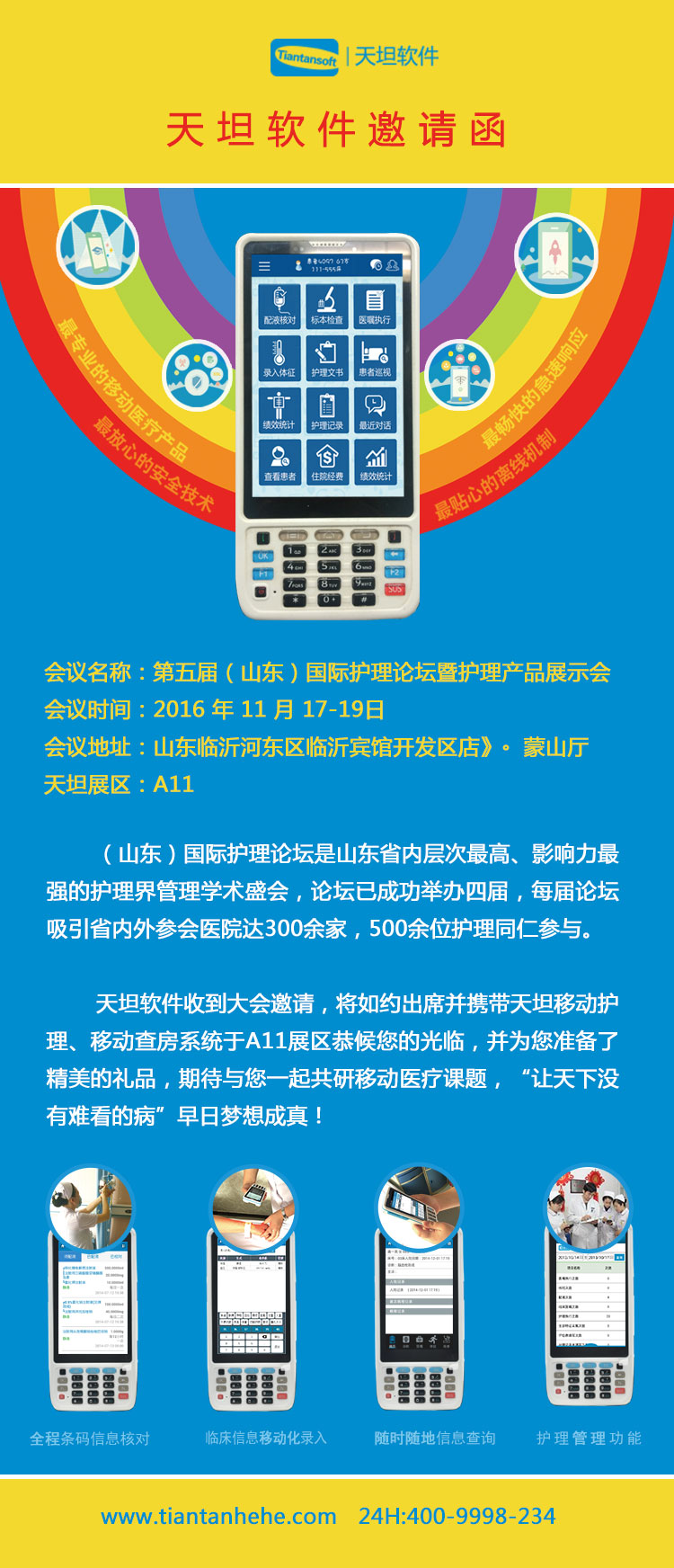 黃金十月,天坦軟件收到 “第五屆(山東)國際護(hù)理論壇暨護(hù)理產(chǎn)品展示會(huì)”的邀請(qǐng),會(huì)議將于2016 11 17-19日,在臨沂賓館開發(fā)區(qū)店舉行。天坦軟件將攜天坦移動(dòng)護(hù)理、天坦移動(dòng)醫(yī)生等系列產(chǎn)品,于A11展臺(tái)前恭候您蒞臨指導(dǎo)工作。