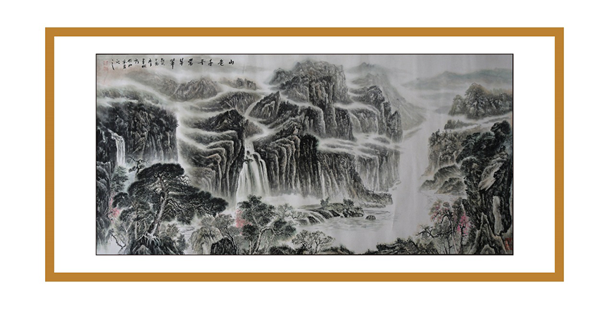 欣賞譚老的畫作,使人有一種難以言表的美感,問及原因,他說:“為了研究山水,我閱讀了大量古、今書籍,我發(fā)現(xiàn)歷朝歷代對山水國畫都相當(dāng)重視,山水被視為鎮(zhèn)宅的代名詞,一直以來在帝王家它都是以圖騰的形式存在的。”但為了能夠更好地傳承歷史文化,他鉆研國學(xué),將儒、釋、道的精髓理念及思想融入到作品中,追求創(chuàng)造的是一種“和合”之感,讓這大氣之圖騰成為真正意義上的圖騰。